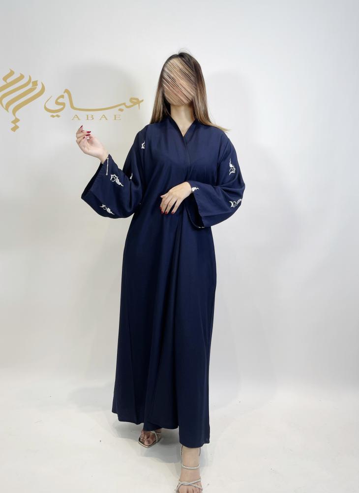 عباية كحلية داكنة بتصميم انسيابي، مصنوعة من قماش اللنن يمنحها مظهراً أنيقاً ومريحاً، مزودة بأكمام واسعة مزينة بتطريز أبيض ناعم يعكس لمسة فاخرة وعصرية، مما يجعلها خياراً مثالياً للإطلالات اليومية والمناسبات الراقية.